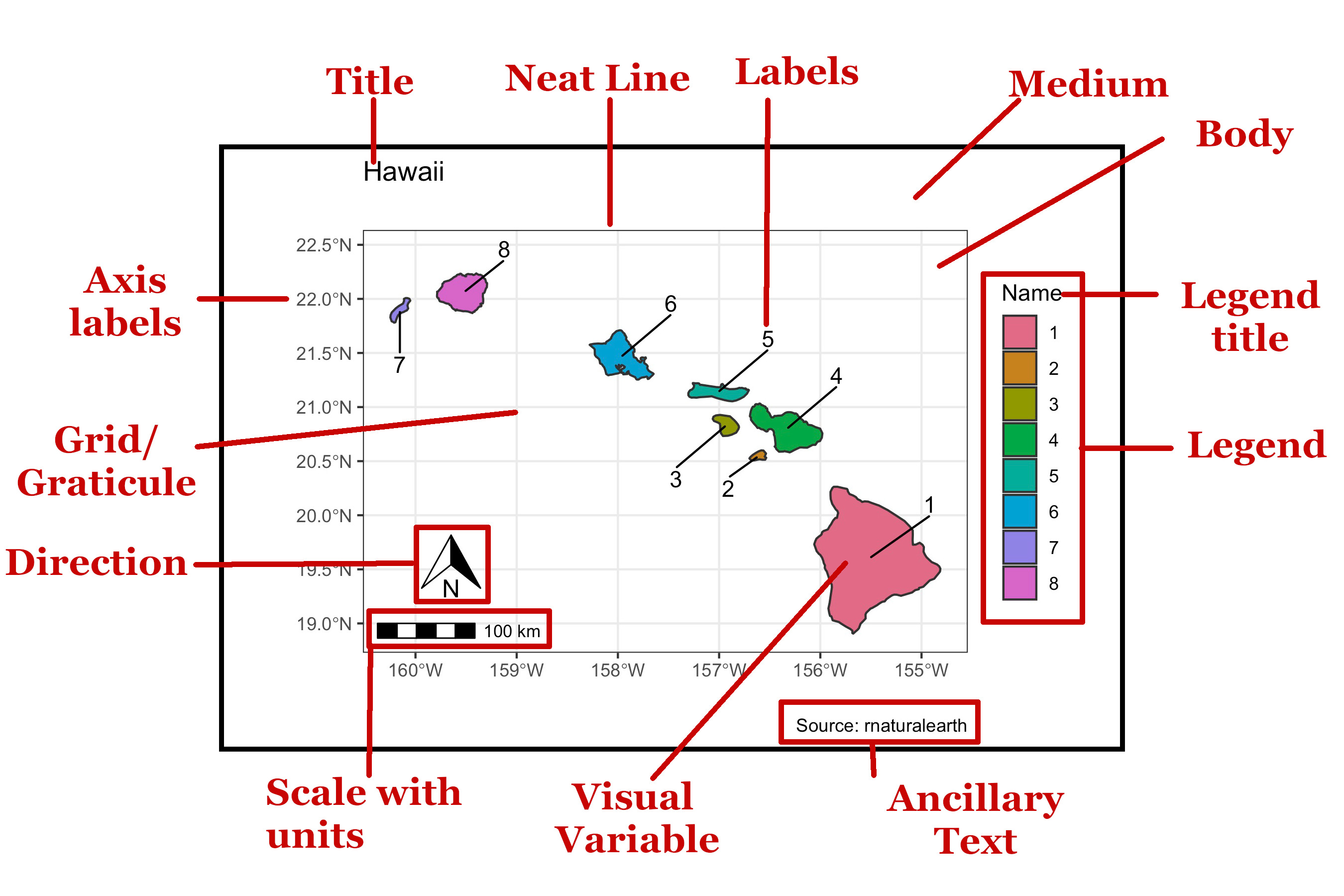 | 7 | Legend | The legend gives a palette of colors, or other geoms, for the viewer to match to the map. |