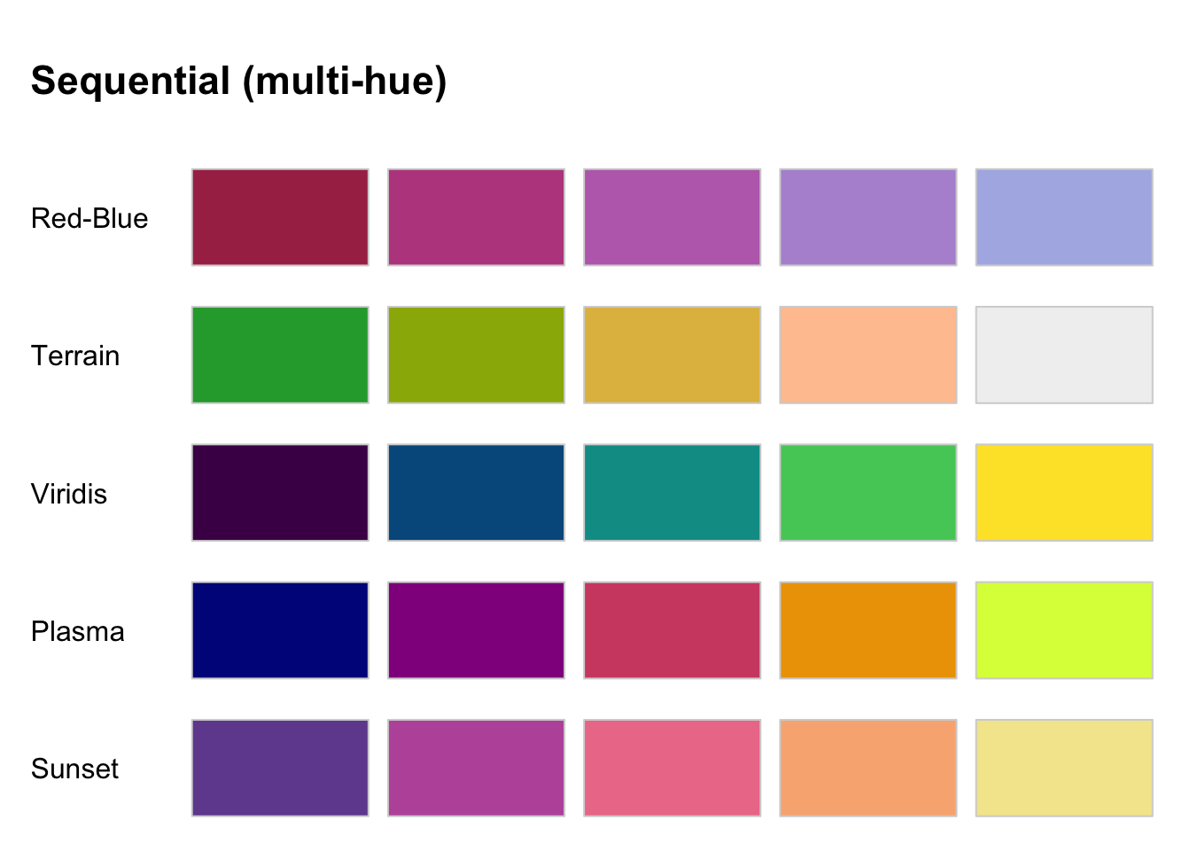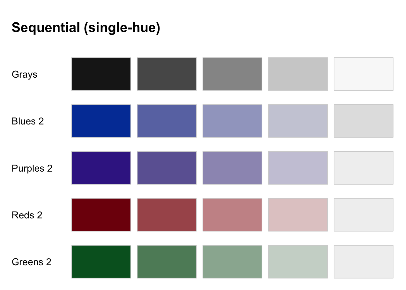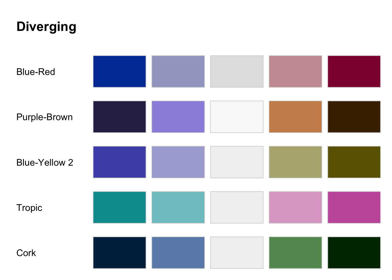 Users should select a color palette from a proven package. The overwhelming consensus is that those lacking design experience should “instead draw from preconstructed ramps.” (Smart et al., 2020) The good news is that “automatically generated color ramps” can perform at least as well as designer ramps in many circumstances. (Smart et al., 2020) Several excellent packages are available: RColorBrewer, colorspace and rcartocolor to name a few. There are also a couple of packages that aggregate palettes: pal and paletteer.