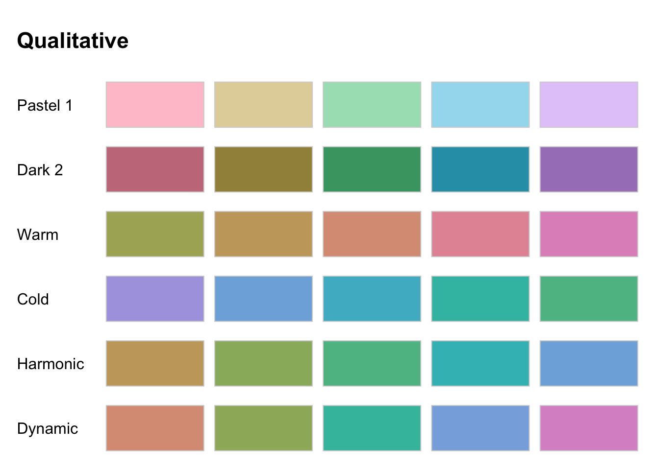 Qualitative palettes are used for categorical data “where no particular ordering of catgories is available and every color should receive the same perceptual weight.”