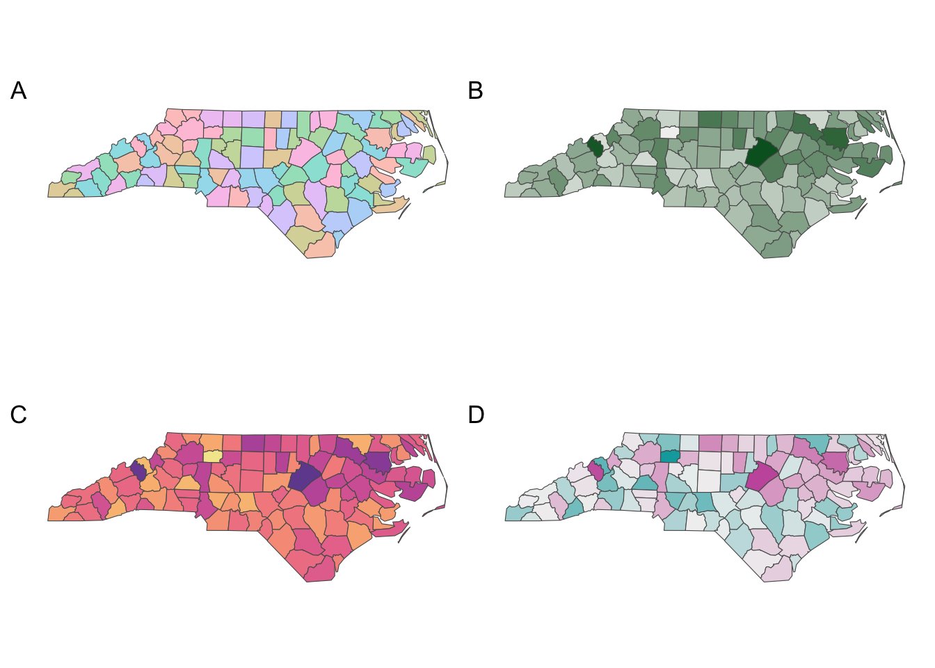 colorspace palette applied to the sf nc dataset. ‘A’ is a ‘Pastel 1’ palette applied to a qualitative variable; ‘B’ is a ‘Greens 2’ palette applied to a continuous variable; ‘C’ is the ‘Sunset’ multi-hue palette applied to a continuous variable; and ‘D’ is a the diverging palette ‘Tropic’ applied to a continuous variable.9 Key Points