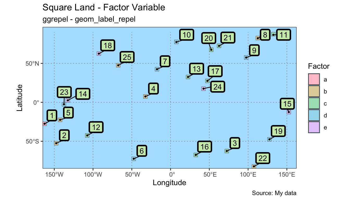 Unless a viewer is personally familiar with a map’s content, textual descriptions will be necessary. “Text” and “label” are terms of art and have specific meaning within the R-spatial packages. A “label” is text placed on a background with a border. The addition of a background can bring greater contrast and attract the attention of the viewer. “Text” is just basic text without any background.