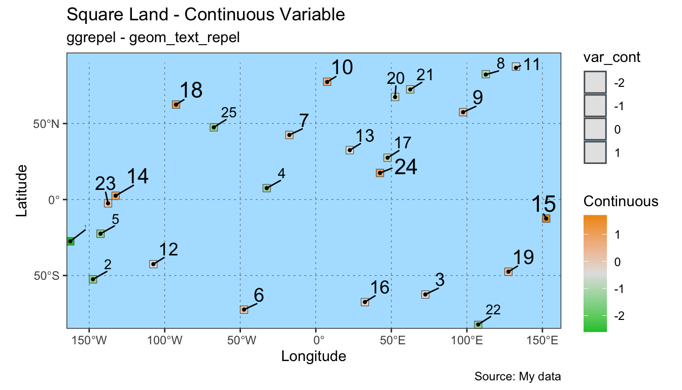 geom_text_repel(). Note that a variable is being mapped to the size attribute for the text.