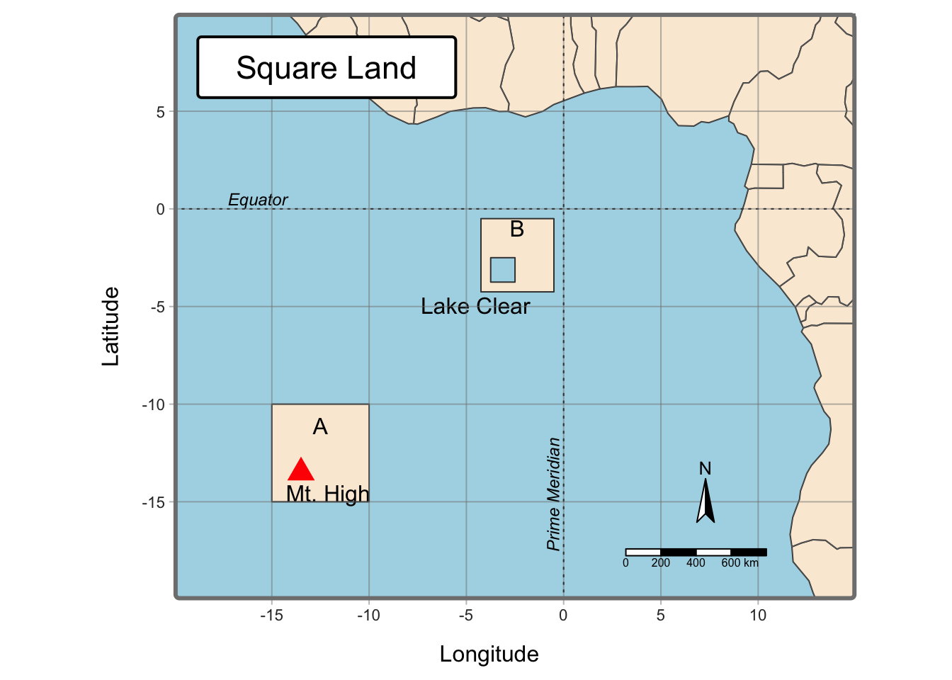 Like the ggplot2 example, this second example will begin to resemble an actual map. First, Africa will be added as a base layer via the rnaturalearth package. Then, two sf class squares will be created. These squares/islands are around the intersection of the Equator and the Prime Meridian. Then, a mountain, a lake, the Equator and Prime Meridian will be added along with the accompanying text and labels. Finally, the background will be colored blue to resemble water.