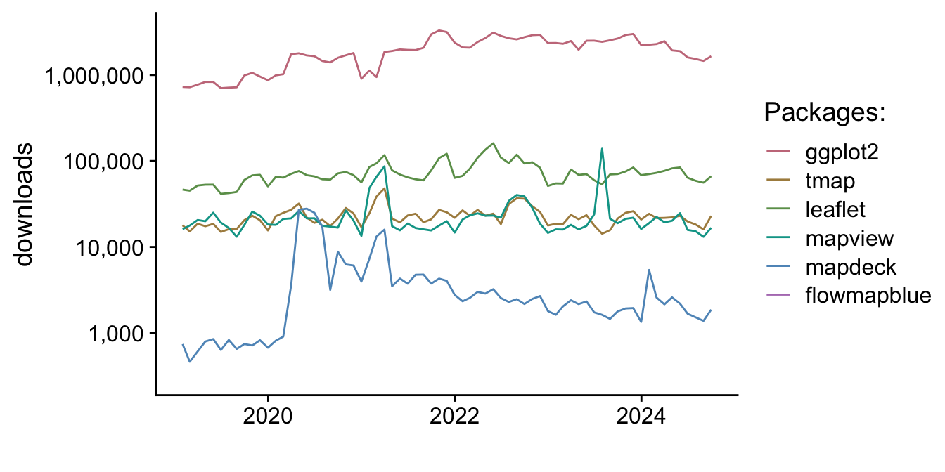 Plotting spatial data is divided into three categories: (1) general concepts, (2) static maps and (3) interactive maps. The first section “general concepts” covers some background about plotting and expands the ideas to maps. For example, maps are expected to contain certain elements like a compass rose, whereas that element would not be expected in a garden-variety scatterplot. The second and third sections deal with R packages for producing maps. To give context and a summary, a plot is included of package downloads and a table summarizing their uses.